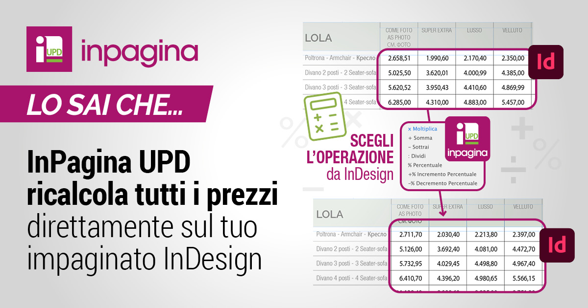 Se anche tu hai la necessità di ricalcolare spesso e rapidamente i prezzi del tuo listino prezzi, menù, catalogo o altro impaginato creato con Adobe InDesign … allora hai bisogno di InPagina UPD!